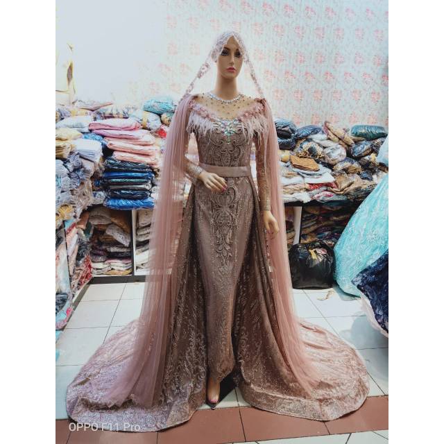 Beli gaun pengantin muslimah modern dengan ekor warna rose gold.